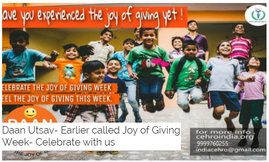 The joy of Giving Week is a perfect opportunity for you to say that you care. Daan Utsav is a festival which is not associated with us or with any other NGO. It is like any other festival successful when we celebrate it together. Let us spread goodness by giving.