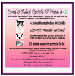 Till Phase 3, a total of 4136 families received dry RATION kits, 620400 meals were served across 25 slums in Delhi and with the ongoing lockdown Phase 4, our team is still continuing their effort and are working towards the mission of providing rations to the needy families everyday.