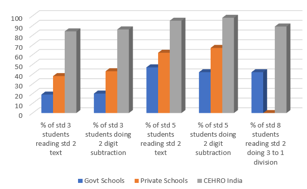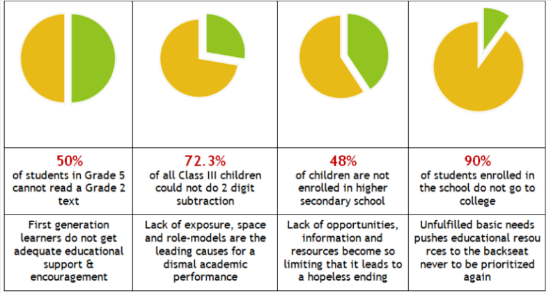 Even students who are enrolled in school, around 52% of standard 5 students cannot read a standard 2 level text and only 43.3% students in class 8th can solve a 3 digit to 1 digit division problem in mathematics. Out of 46 students in class 12th enrolled in a Higher Secondary School in Munirka 45 students passed 12th Board CBSE Examination but only 5 went to a college in the academic year 2016-17. Almost more than 70 % of the students dropped out before reaching 12th grade and whoever were able to pass 12th grade, only 10% of them were able to reach college.