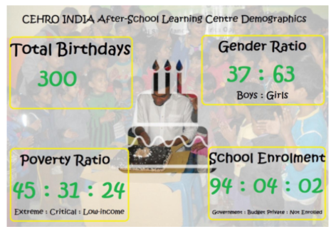 Apart from nutritious food, happiness and love make children healthy. Shared birthday celebrations on 203/365 days in a yearwill affect the health of children at the centre. It will eradicate malnutrition in 300 underserved children in the year 2018.