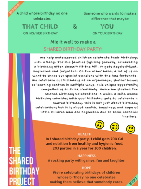 The Shared Birthday Project helps underserved children celebrate their birthdays with a bang. For the families fighting poverty, celebrating a birthday often doesn't fit the bill. It gets deprioritized, neglected and forgotten. On the other hand, a lot of us do want to share our special occasions with the less fortunate. We celebrate our birthdays at an orphanage, shelter homes or learning centres in multiple ways. The shared birthday project is one of suh ways in which you can share the joy with children by sharing your birthday with them.